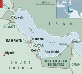 The tiny island nation of Bahrain plays a big role in America's Middle East strategy. In fact, more than 6,000 U.S. military personnel and contractors are located just five miles from where government security forces violently put down demonstrations this week.Map credit.