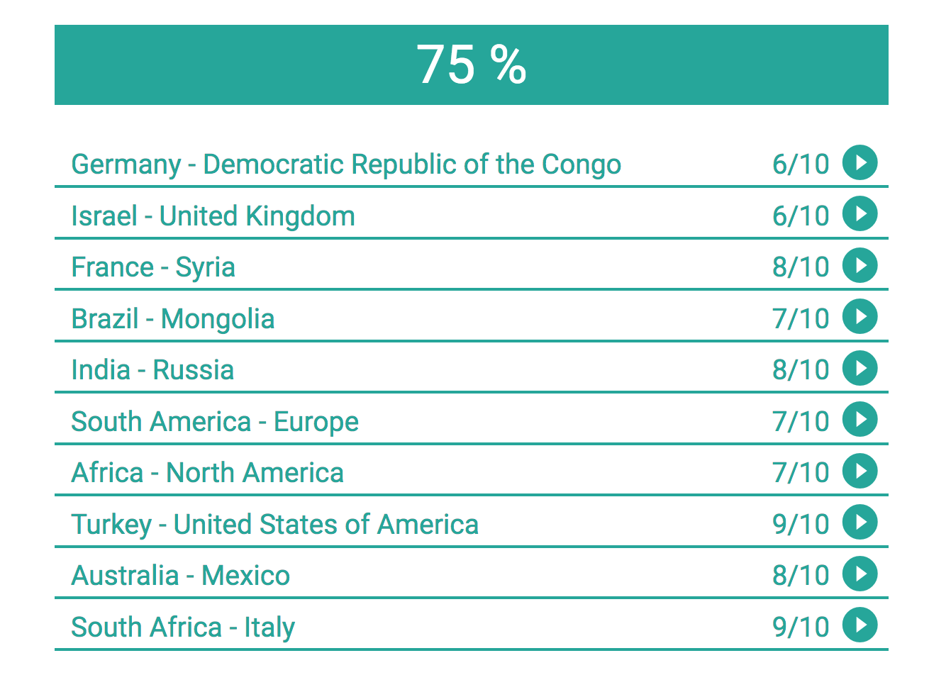 ReplyDelete86. Proud that I got DRC-Greenland 10/10. But I also got some easy ones like Africa-Europe and North America-South America.