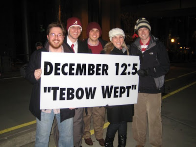 Very funny. But just to make sure I stay on the right side of 'karma,' let me say that, for me, it's not so much that Tebow wept; lots of guys do that after big games - altho, admittedly, not as much or for as long as he did. I think the shadenfreude we're all feeling is attributable to the media's premature canonization of St. Tebow. In my entire, sports-obsessed life, I've never seen such open-mouthed media tongue kissing with a guy who CLEARLY was just great athlete who was also a good guy - not the Student-Athlete Messiah. I don't think this was an example of the more typical instance of enjoying a cocky celebrity knocked down a peg. This was more of a universal dogpile on media excess exposed.