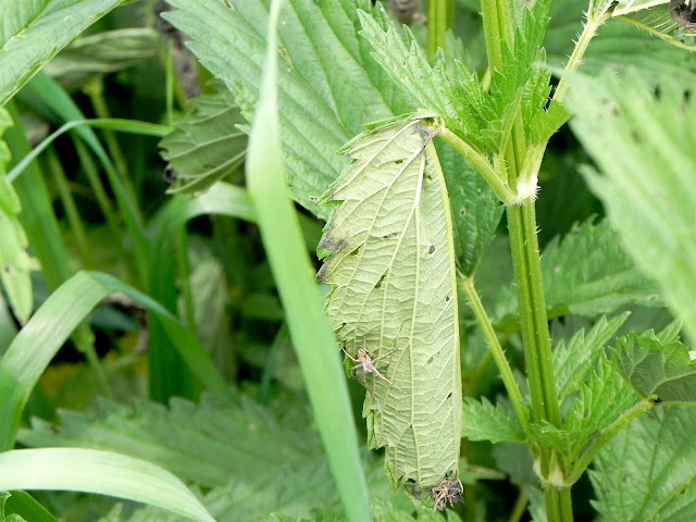 Now, the question was - could I harvest some of these to take home to raise and release the butterflies? The first question to be answered was what kind of nettles were these?? There are many nettles, but only two important categories - stinging nettles (genus Urtica) and "false" (nonstinging) nettles (genus Boehmeria). I'm not knowledgeable enough to know the difference. If they were false nettles, I could just grab some stems to take home; stinging nettles require a modicum of caution.