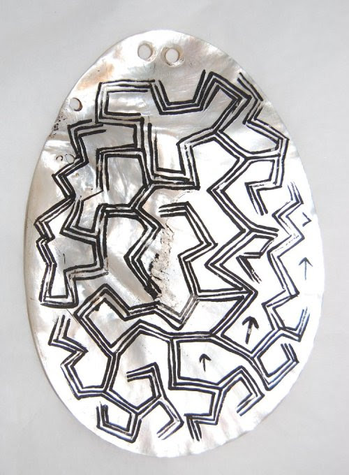 The top one is made of mother-of-pearl, crafted by an indigenous Australian.   The lower one is made of vegetable fiber, and was made in New Guinea.   Both are from the collections of the British Museum, and were posted at A London Salmagundi.