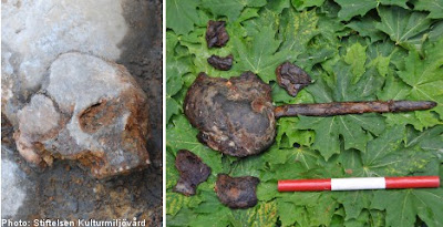 This excavation site has been a regular source of unique discoveries over the past two years. It gained immediate notoriety last summer when a Stone Age antler bone dildo was discovered by the same team that found the spiked skulls. Then last October the team discovered a treasure trove of artifacts — parts of a bow, a paddle, an axe handle and blade — all made out 9000-year-old wood.