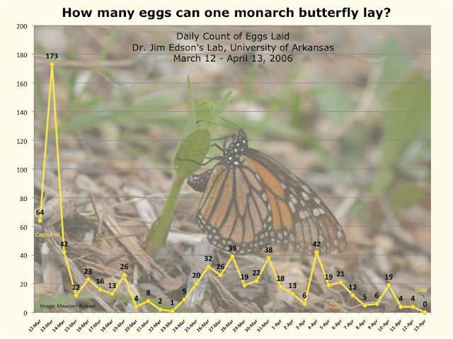 ReplyDeleteThis graph shows that this particular Monarch butterfly laid about 750 eggs. That may or may not be typical for the species. One of those eggs has to mature and reproduce for the population of the species to persist.