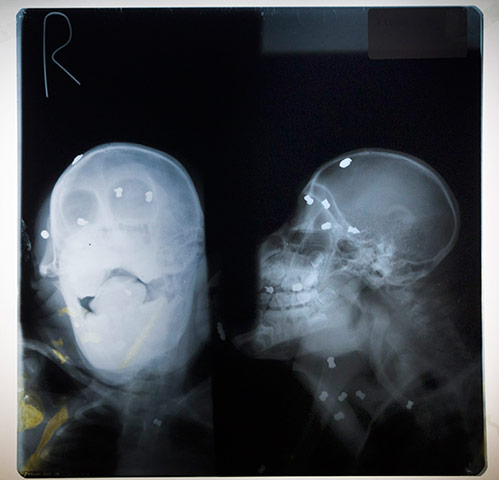 Leuser, a blind Sumatran orangutan has survived poachers, air rifles, and deforestation during his 13 years of life. Leuser has been saved twice by the Sumatran Orangutan Conservation Program (SOCP), but now resides in captivity at their quarantine centre in Medan, Sumatra, after being shot 62 times by villagers seeking entertainment.These are his skull xrays: