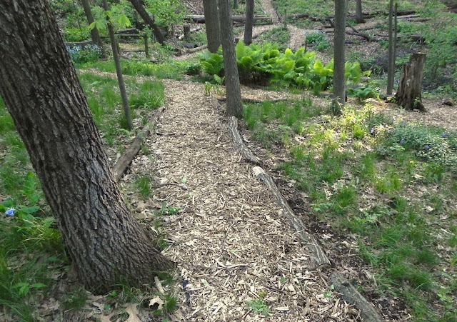 Last fall I spent uncounted hours laying down landscape fabric and then dragging tarps full of hardwood mulch to the woods to create walking paths. There's still lots of work to do to finish the paths (I'm laying down logs from the cut trees and partially embedding them on the sides of the paths to keep the mulch from spreading. The paths give me a more secure footing for walking and also subdivide the garden into areas where we can experiment with different botanical combinations.
