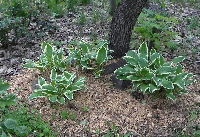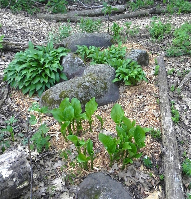 In the Upper Midwest of the U.S., the primary choices for foliage plants in shaded woodlands are hostas. This cluster at the base of the arching tree was one of the first I planted perhaps 10 years ago. It will fill out to cover the entire mulched area before midsummer. All except one of the clusters have had Repellex tablets placed in the root zone in an effort to dissuade rabbits from enjoying lunch here; one plant serves as a control. We'll see what happens.