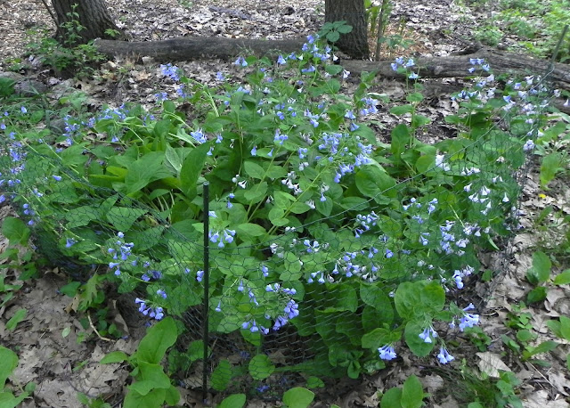 We've added bluebells; these are not the English bluebells that you see in immense masses in the forests of the National Trust in Britain. I put chicken wire around this cluster this week to keep the rabbits at bay, because we want to harvest the seeds to scatter in other areas of the woods. Last summer the rabbits nibbled these down to the ground.