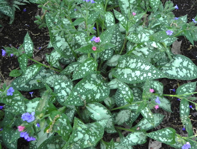 An even more striking foliage plant in my view is Pulmonaria spp. I think we planted just a few; now they have proliferated in scattered locations in the woods. I love the leaf patterns; the flowers are a bonus in the early spring but don't last long.