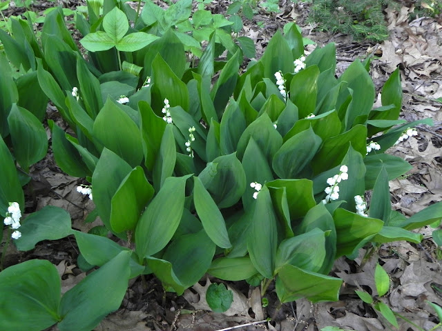 These Lilies of the Valley came to us in an exchange with a neighbor to whom we donated some of the pulmonaria. The other flowers in bloom this week include the bleeding hearts (photo at the top of this post), phlox, trillium, bluebells, dandelions, wild geraniums and violets.