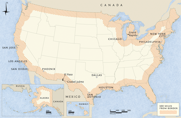 And these CBP agents operate not just at the border itself, but for a hundred miles inside (see the map at top), where two-thirds of all Americans live. Some "roving patrols" extend twice that far.