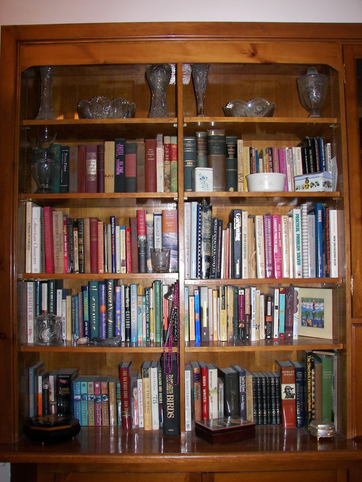 Of the rest I’ll just note where I find myself reaching over and over again…Isabel Allende, birds, Sherlock Holmes, needlework, Tolkein, Angela’s Ashes, Memoirs of a Geisha, Tutankhamun on many covers, Gone With the Wind, Imperial Woman by Pearl S. Buck.