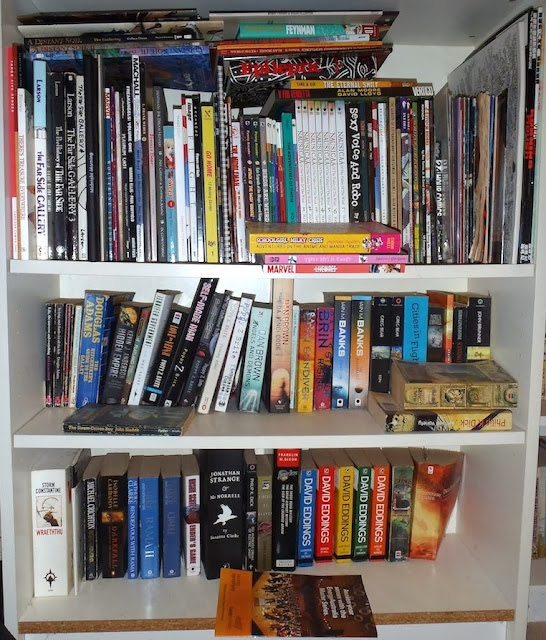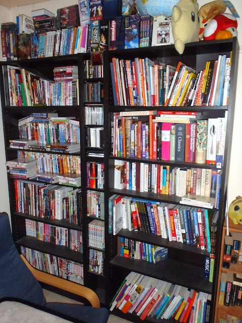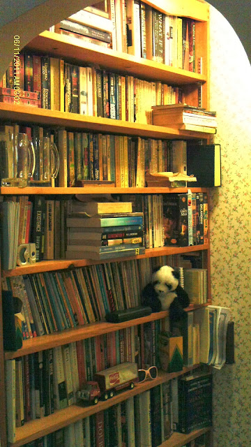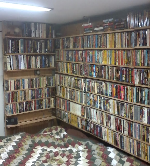 The attached photo is of half the bookcases in our "studio", and the ones on the left represent all the science fiction paperbacks my husband has purchased and read since he switched from comic books at age 14. They are double-depth, and roughly in alpha order by author. This year he decided to re-read his way through Heinlein and we had all but two titles on hand. Thank goodness he switched a few years ago to borrowing from the library.