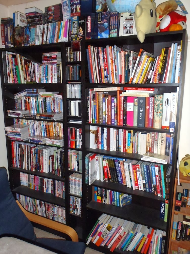 Top photo: Left shelf is my wife’s manga collection, mostly in Japanese. Also a shelf of video game art books. Right shelf is non-fiction, mostly art and cooking related. Small overflow fiction shelf peeking in there on the right. Ancient anime collection on top.