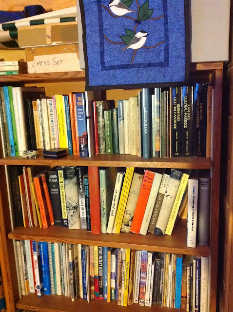 Here are topically organized shelves, Chess set (tournament size) on the top, then some theory books, mountaineering guides and reports, bicycling, geology and ecology.
