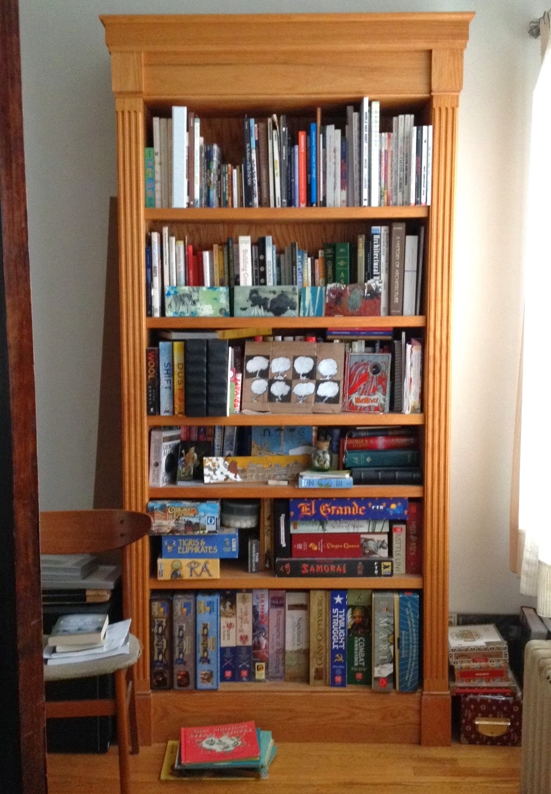 Bottom 2 shelves: This is a portion of my board game collection. I tend to put my favorites here that have nice artwork or impressive (often historical) subject matter, like the Cold War (Twilight Struggle), the Austrian Succession (Maria) and the French and Indian War (A Few Acres of Snow).